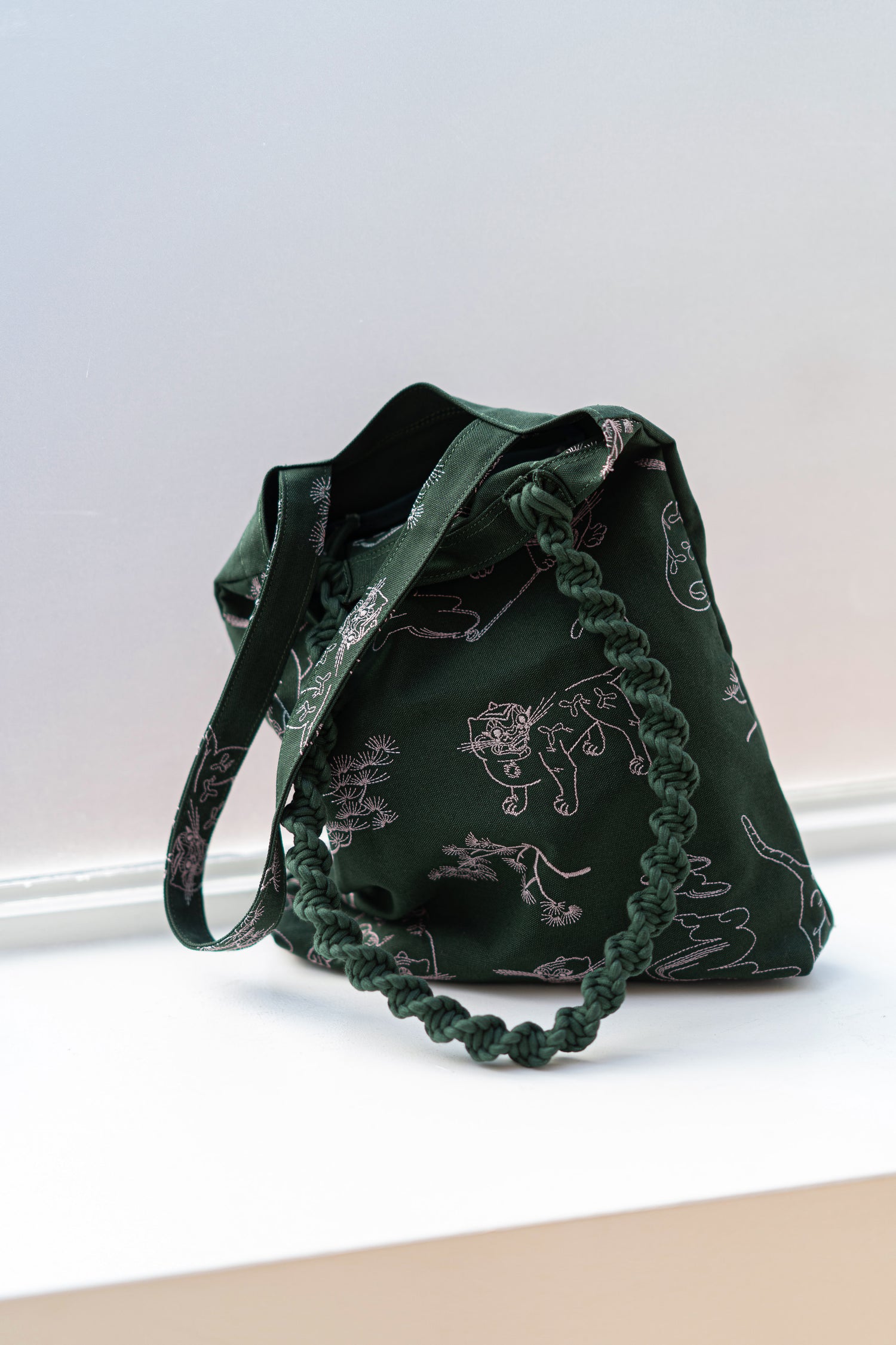 Inspired by traditional Korean knots, this distinctive bag features our signature unbalanced knot design. The tiger embroidery, inspired by the chest insignia of Joseon Dynasty officials' robes, showcases our unique pattern. Paired with the pine tree, it reinterprets the classic 'Songha Menghodo' motif.